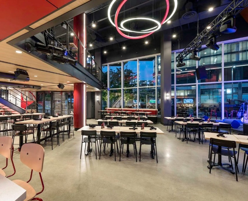 Located inside the newly developed Capital One Center in Tysons, Virginia, Starr Hill Brewery blends live music, craft food and beer, and a layered industrial-meets-hospitality design into an inviting multi-level destination. With a rooftop beer garden already attracting large crowds in Richmond, Starr Hill saw the opportunity for an all-season venue that could deliver the same vibrant experience with a full kitchen and live music stage.